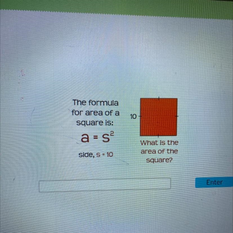 The formula for area of a square is: a=s² side, s-10 10 What is the area of the square? Enter