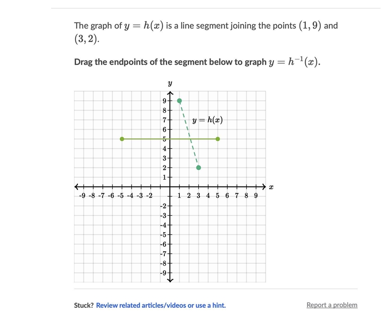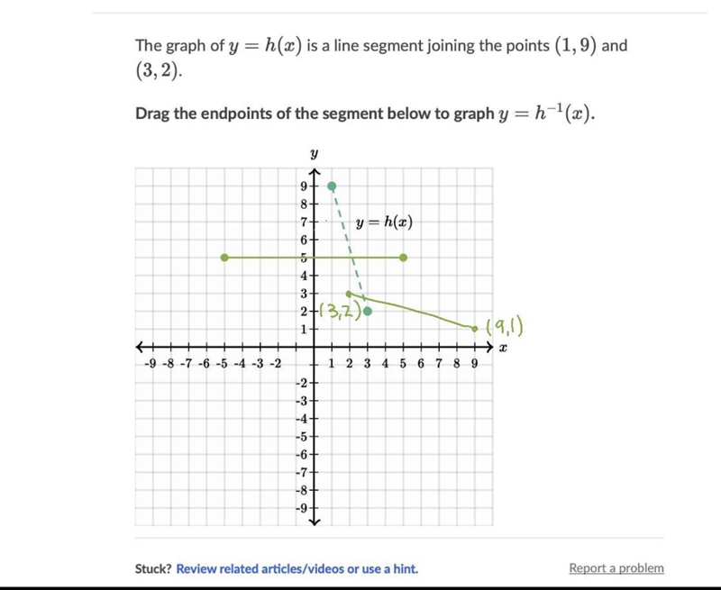 The graph of y = h(x) is a line segment joining the points (1,9) and (3,2). Drag the endpoints of the segment below to graph y = h ^ -1 (x)