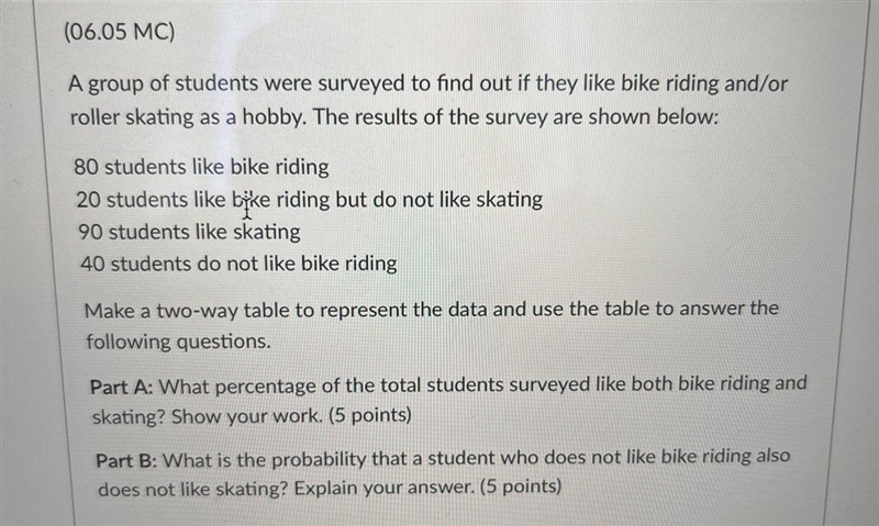 For part A add up all your students then add up all your students that like bike riding and skating (80+90) divide that by the total number of students who took the survey