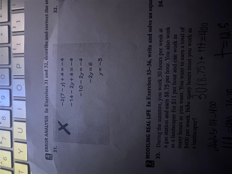 ERROR ANALYSIS In Exercises 31 and 32, describe and correct the error in solving the equation. -2(7-y)+4=-4 -14-2y+4=-4 -10 - 2y = -4 -2y=6 y=-3