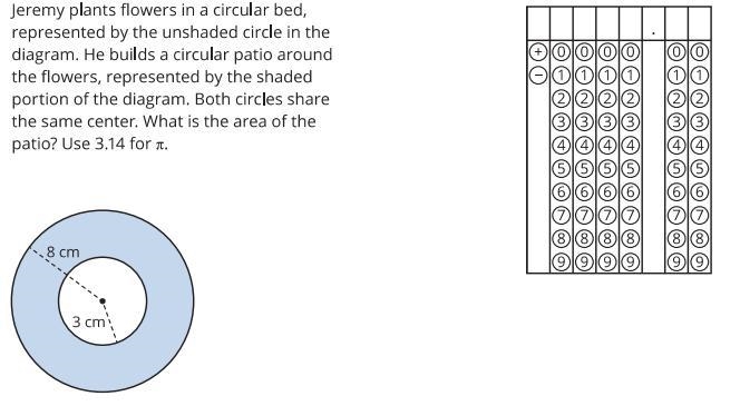 Jeremy plants flowers in a circular bed with a diameter of 3, represented by the unshaded circle in the diagram. He builds a circular patio around the flowers with a diameter of 8, represented by the shaded portion of the diagram. Both circles share the same center. What is the area of the patio? Use 3.14 for \pi.