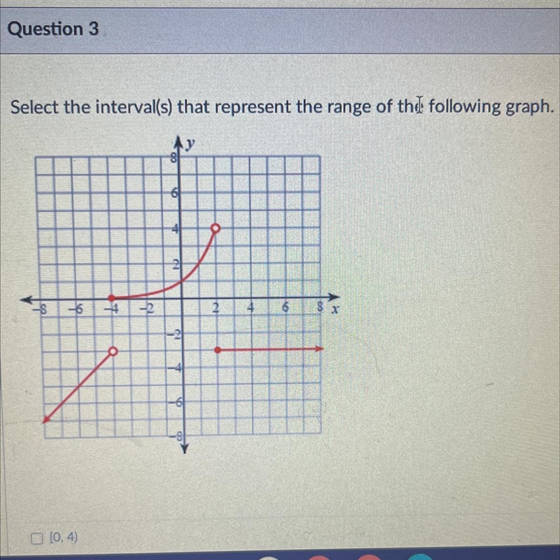 Select the Interval(s) that represent Range PLEASE HELP DUE TODAY (0,4] (-infinity,infinity) (-infinity,4) (-infinity,-3) (-infinity,-3] (0,4]