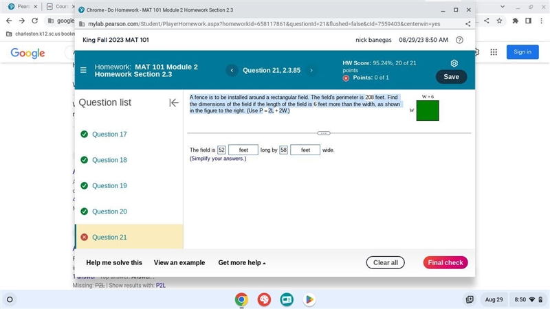 Therefore, the width of the field is 49 feet. We can use the expression for L in terms of W to find the length: