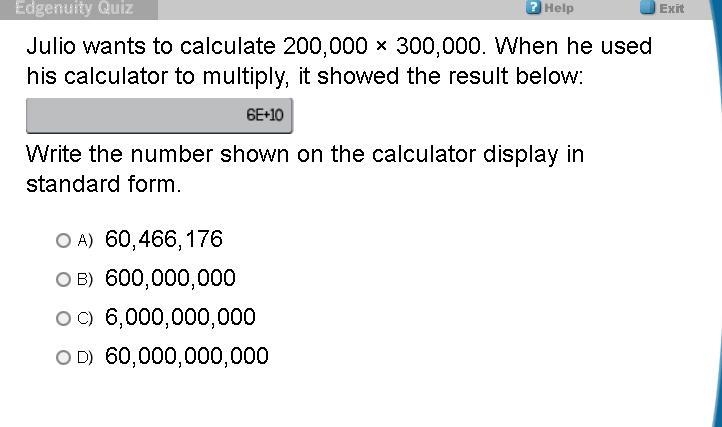 Julio wants to calculate 200,000 × 300,000. When he used his calculator to multiply, it showed the result below: