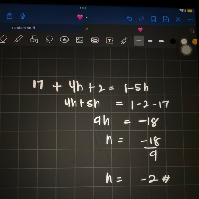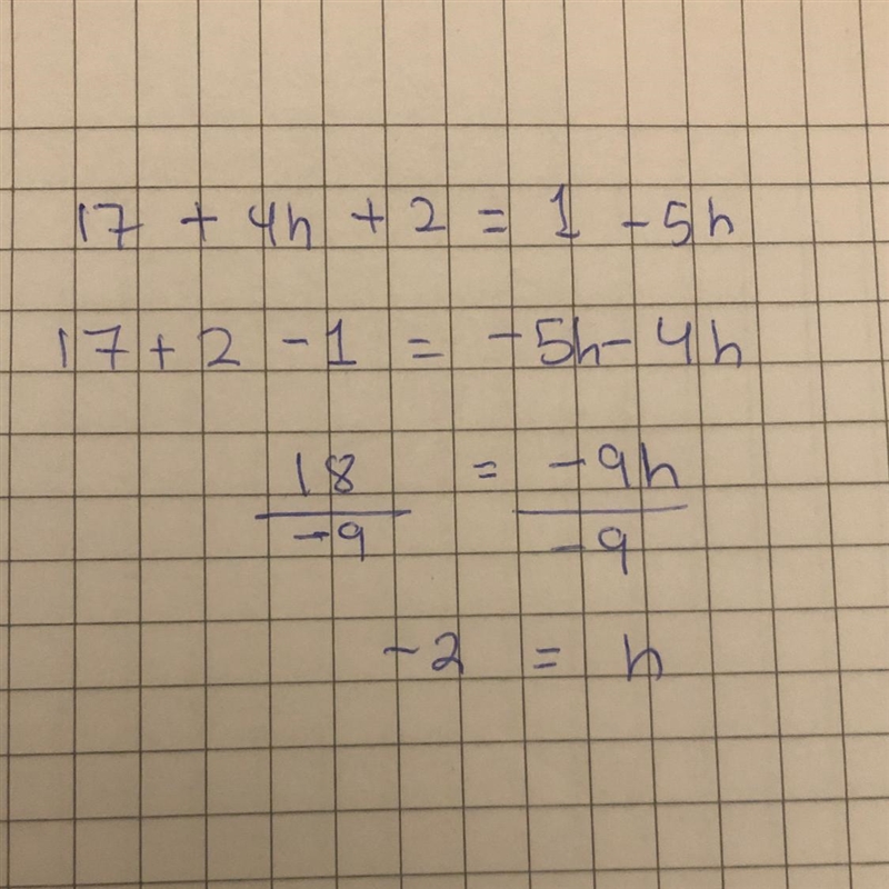 Solve for H. 17 + 4ℎ + 2 = 1 − 5ℎ