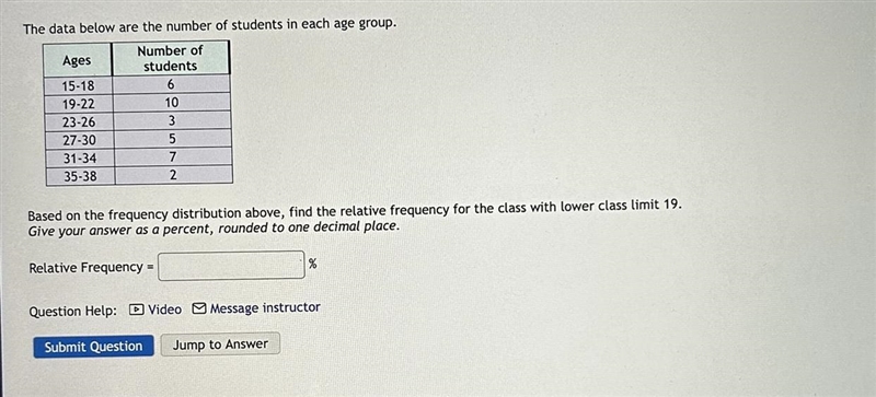 To find the relative frequency, divide the number of students in the age group 19-22 (10) by the total number of students (33).