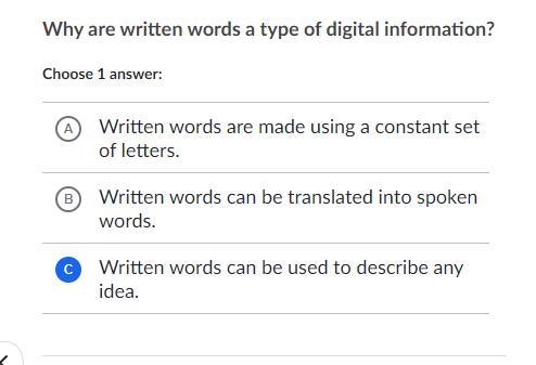 The image is asking why written words are a type of digital information. The answer is B: Written words can be translated into spoken words.