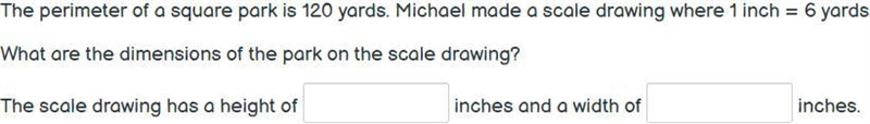 The park is square, so all 4 sides have equal lengths. Perimeter = 4x, where x is the length of a side. The length of any side is therefore 120 yards/4 sides = 30 yards/side. Since 1 inch = 6 yards in the scaled drawing, we can say that for each 30 yard side, the scaled size would be (30 yards)*(1 inch/6 yards) or 5 inches/side.