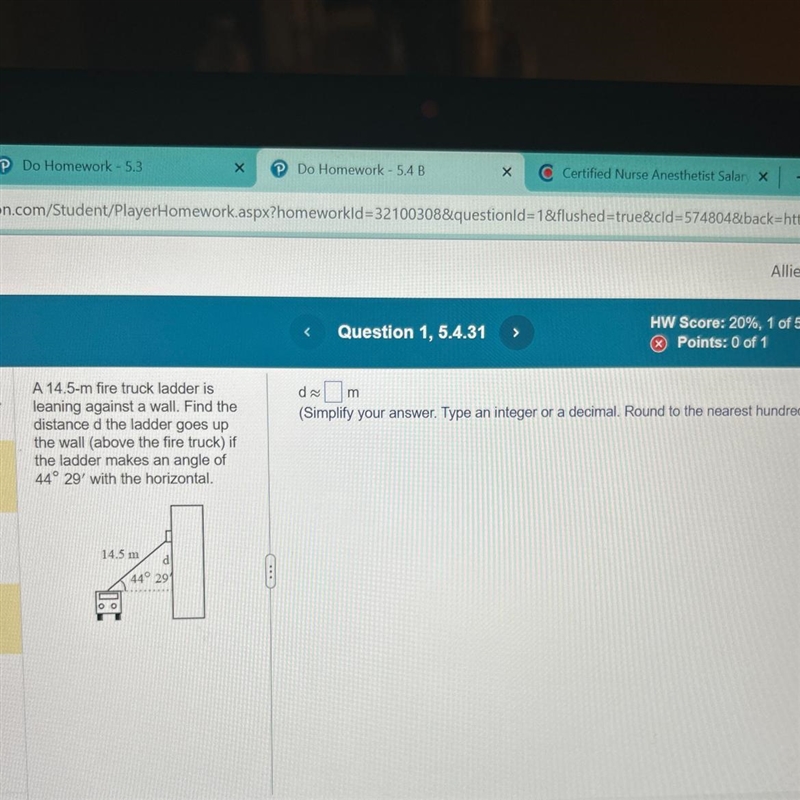 A 14.5-m fire truck ladder is leaning against a wall. Find the distance d the ladder-example-1