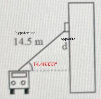 \sin( 14.48333^o )=\cfrac{\stackrel{opposite}{d}}{\underset{hypotenuse}{14.5}} \implies 14.5\sin(14.48333^o)=d \implies \stackrel{ meters }{3.63}\approx d