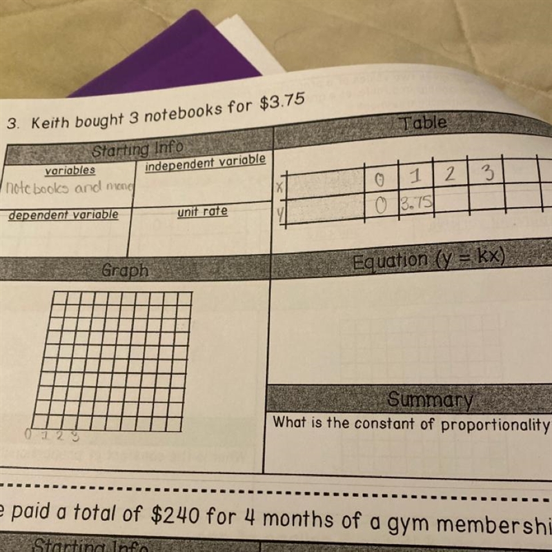 Keith bought three notebooks for $3.75. This can be represented as an equation:
