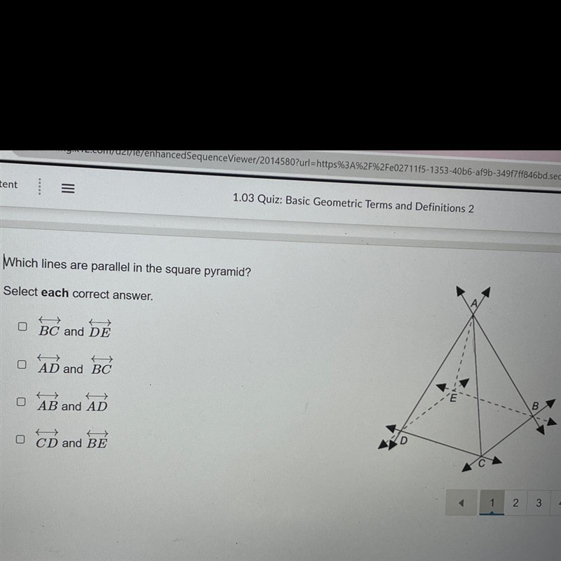 Which lines are parallel in the square pyramid? Select each correct answer. OBC and DE O AD and BC OAB and AD CD and BE 0 B