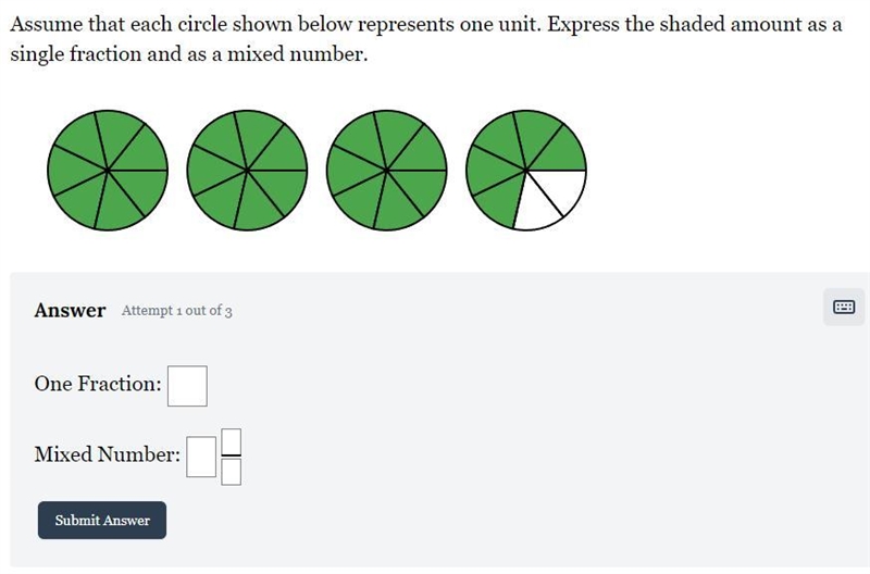 We have 3 full cakes plus an additional 5/7 of another cake.