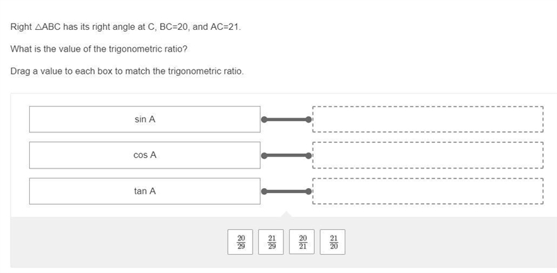 (50 POINTS PLEASE HELP) Right △ABC has its right angle at C, BC=20, and AC=21. What is the value of the trigonometric ratio? Drag a value to each box to match the trigonometric …