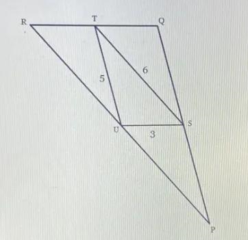 Triangle STU is formed by connecting the midpoints of the side of triangle PQR. The lengths of the sides of triangle STU are shown. What is the length of overline PQ Figures not necessarily drawn to scale.