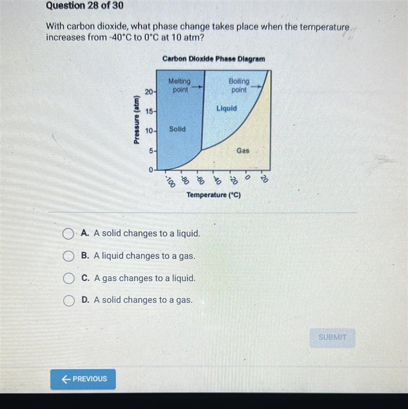 With carbon dioxide, what phase change takes place when the temperature increases from -40°C to 0°C at 10 atm? Pressure (atm) 20- 15- 10- 5- Carbon Dioxide Phase Diagram Melting point Solid -100 Boiling