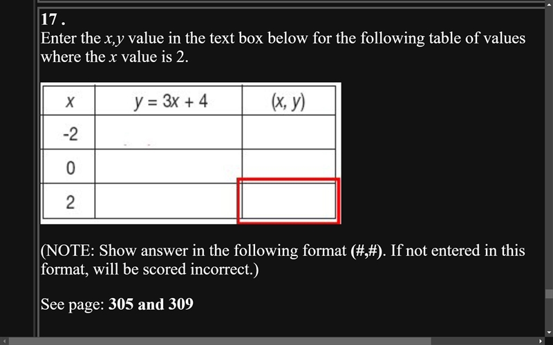 Enter the x,y value in the text box below for the following table of values where the x value is 2.