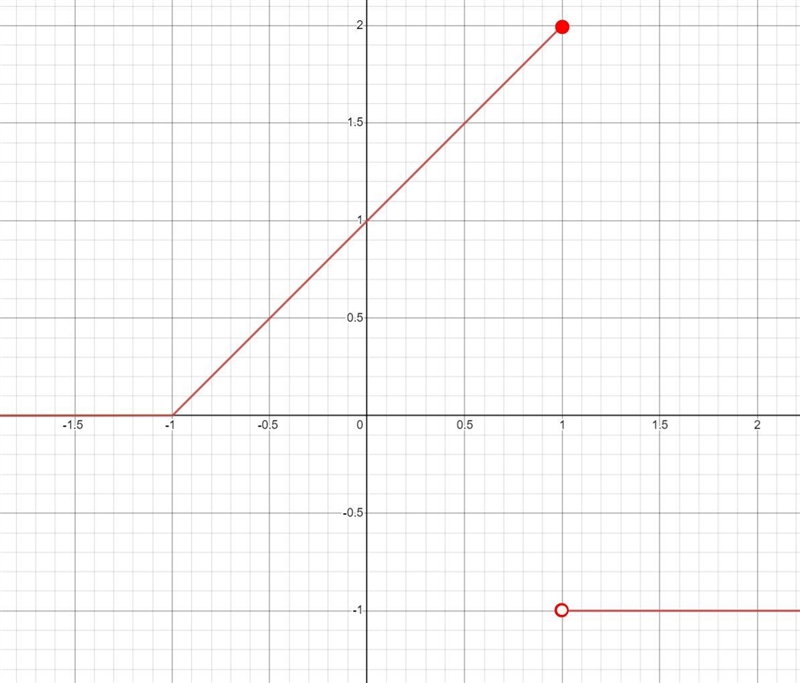 The next part is that between x = -1 and x = 1, y = x + 1. For this, we will draw a line intersecting the y-axis at (0, 1) with a slope of 1. Then, on the right side, we will draw a closed circle representing "≤" equal to.