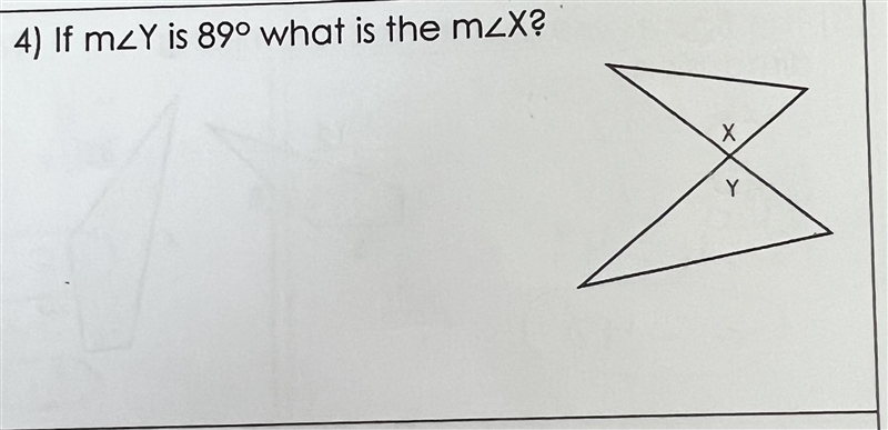 Because these are opposite angles and the lines that make up the angle of y and x are straight lines this would mean that the opposite angles (x and y) are equal. Since y = 89 degrees then x would be 89 degrees as well.