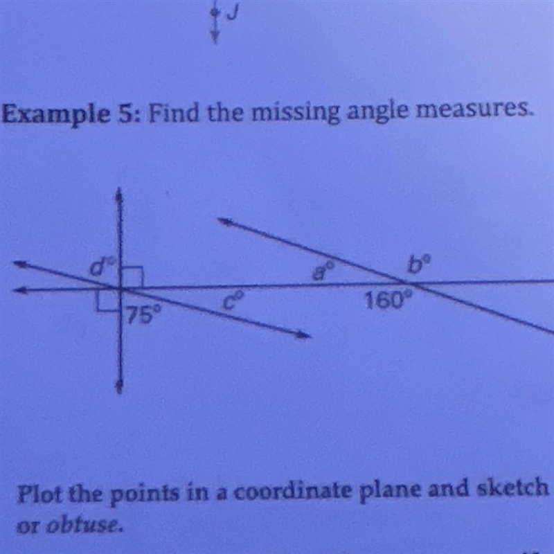 We can start by recognizing that straight lines are equivalent to 180 degrees, and the fact that angles opposite each other are congruent. This means that b° is equal to 160°, and because we know a line is 180°, angle a° is 20°. Same thing for the left side - our angles that are given (a right angle equaling 90°, and 75° which when added together give us 165°) we can then determine that c°=180-165. So, logically c°=15°. And following the aforementioned rule we can also determine d° is equivalent to 75°.