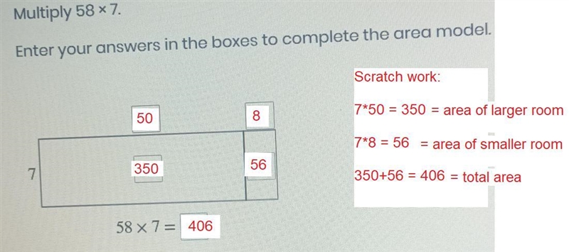 This means 58*7 = 406. Use the lattice method or a calculator to confirm. Or use whichever technique you are previously used to.