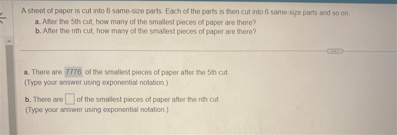 A sheet of paper is cut into 6 same-size parts. Each of the parts is then cut into 6 same-size parts, and so on.