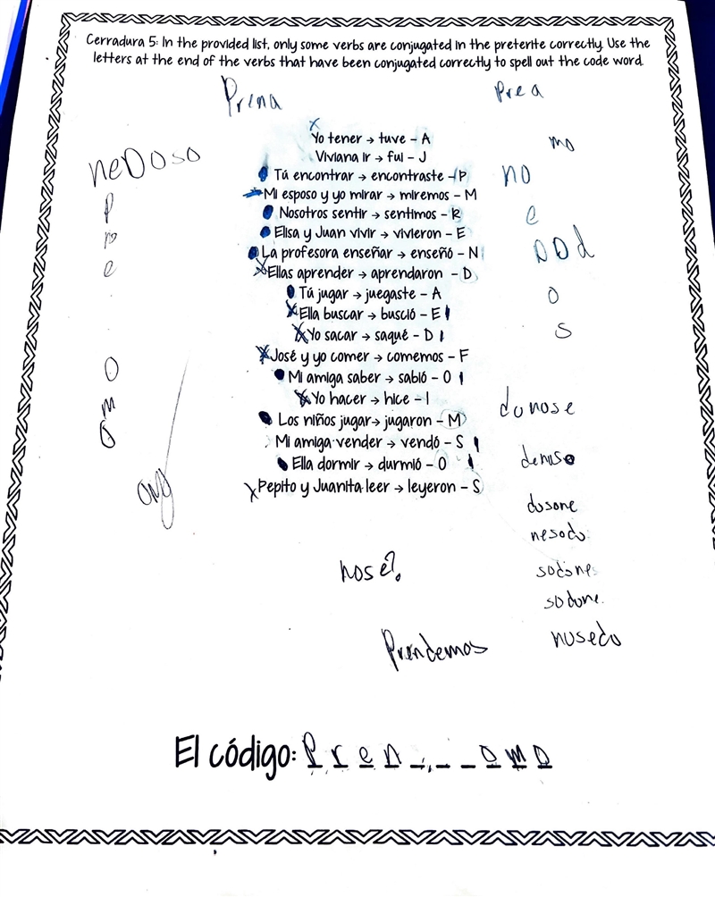 Cerradura 5: I the provide list, only some verbs are conjugated in the priderite correctly. Use the letters at the end of the verbs that have been conjugated correctly to spell out the code word