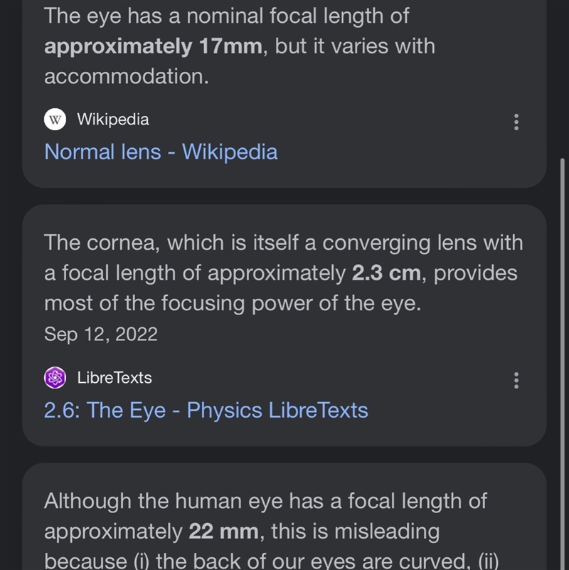 Draw rays to scale to locate the image at the retina if the eye lens has a focal length 2.5 cm and the near point is 24 cm. (Hint: Place an object at the near point.)