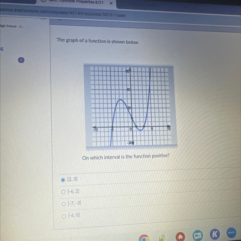 the function is positive on the interval from -6 to 2 since it is in the positive area of y. you chose from 2 to 3 but it is in the negative of y in that case