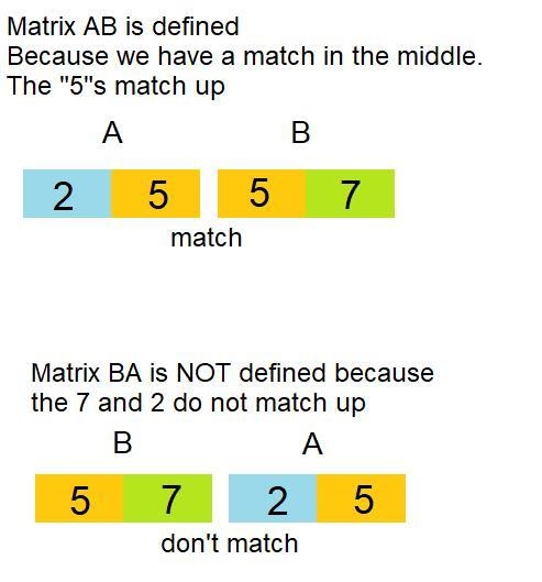 This visual helps us see that matrix product AB is defined, while BA is not defined.