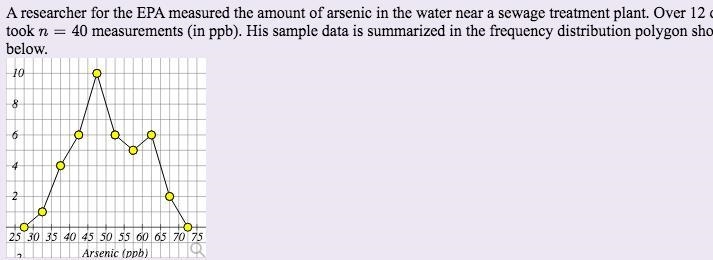 To determine the number of measurements taken within the range of (30, 35) ppb, we need to examine the frequency polygon provided in the question. The frequency polygon shows the number of measurements falling within different range intervals. In this case, the range (30, 35) ppb is not directly represented in the frequency polygon. However, we can calculate the number of measurements within this range by subtracting the number of measurements falling below 30 ppb from the number of measurements falling below 35 ppb.