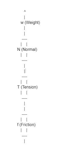 (a) Force Diagram: In the force diagram, the ladder experiences weight downward, countered by the normal force, tension in the rope pulling horizontally, and friction opposing motion.