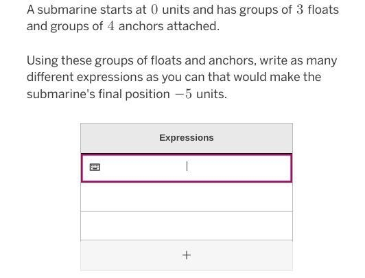 In this expression, the submarine starts with 0 units, adds 3 floats (+3), and then subtracts 4 anchors (-4), resulting in a final position of -5 units.