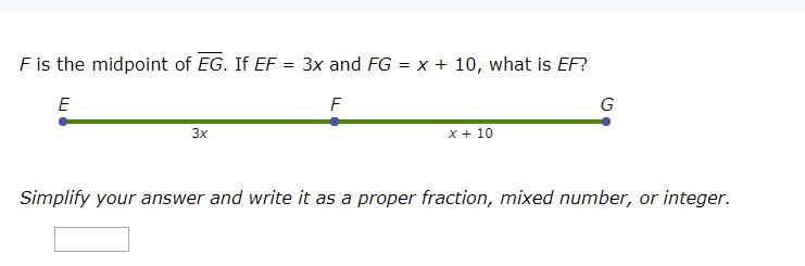 F is the mid point of EG. If EF = 3x and FG = x + 10, what is EF? Simplify your answer and write it as a proper fraction, mixed number, or integer.