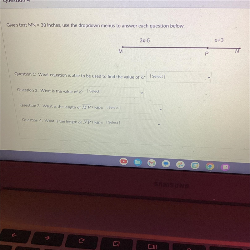 Question 1: 3x - 5 + x + 3 = 38.