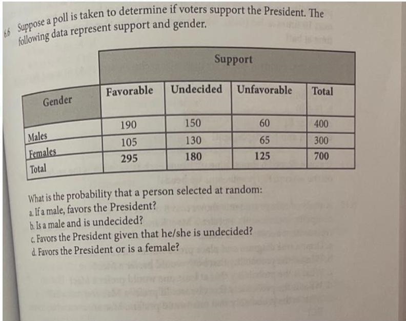 Suppose a poll is taken to determine if voters support the President. The following data represent support and gender. (refer image).