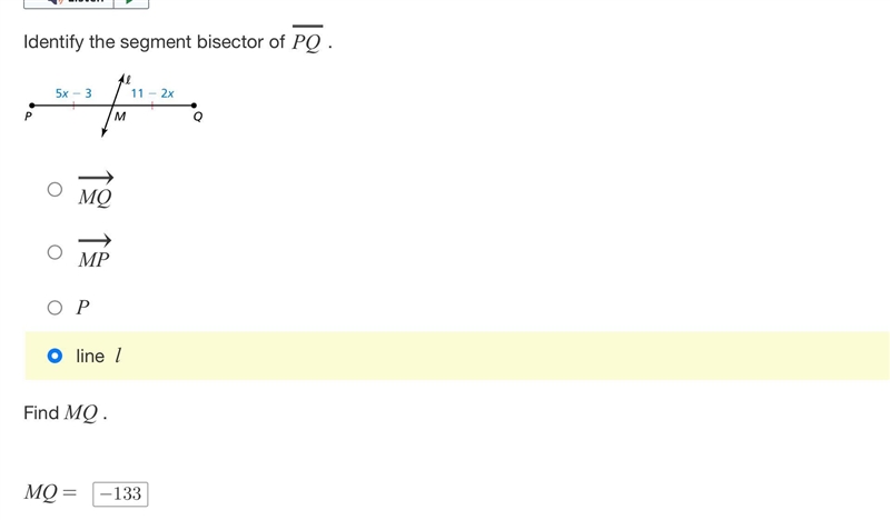 Since line l bisects the line segment PQ at point M, it follows that PM is equal to MQ. To determine the length of MQ, we first need to find the value of x. To do this, we'll set the expressions for PM and MQ equal to each other and solve for x: