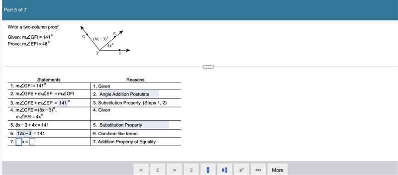 Reason: Add 3 to both sides to go from 12x-3 = 141 to 12x = 144.