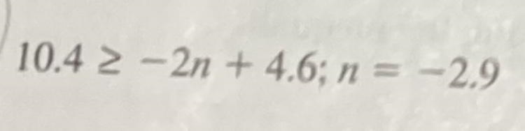Since the last line of the inequality states that 10.4 is greater than or equal to 10.4, which is true, this means that the original inequality holds true when n = -2.9.