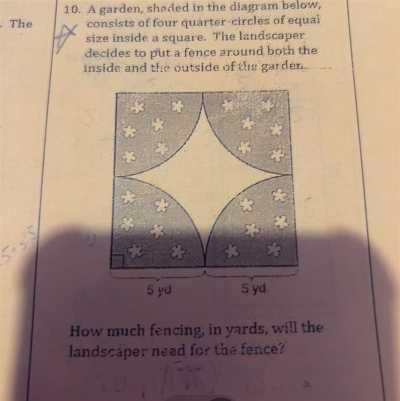 So the perimeter of the garden and thus its fencing including the straight border outside is simply the circumference of the circle and the perimeter of the square
