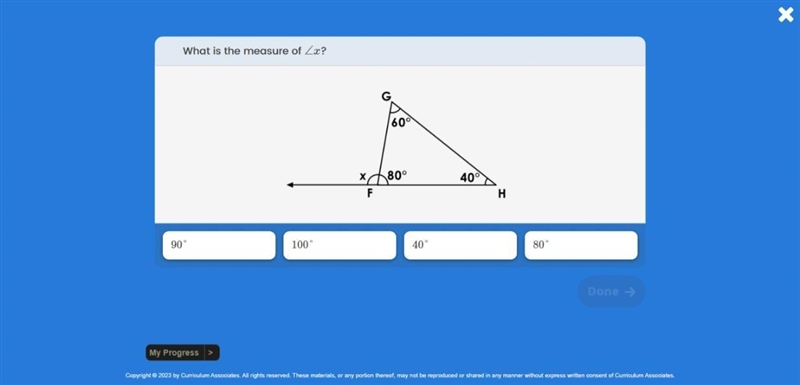 Angle X is 100 degrees because when you are adding up to 180 degrees, subtract the angle you already know from 180 and you will have your answer. 100 degrees