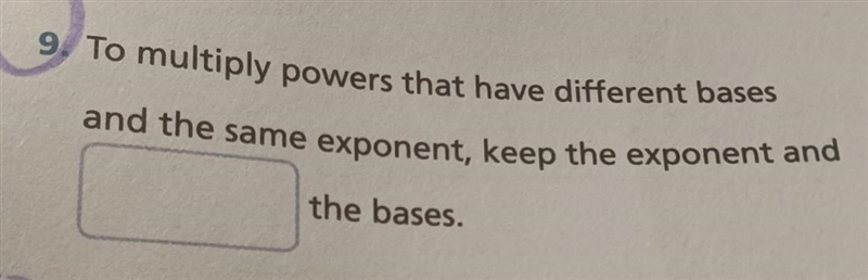 To multiply powers that have different bases and the same exponent, keep the exponent and _____ the bases. (what do I fill in the blank part)