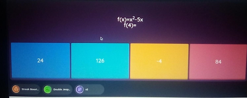 Please Help Me, Now! f(x)=x^2-5xf(4)= A. 24 B. 126 C. -4 D. 84