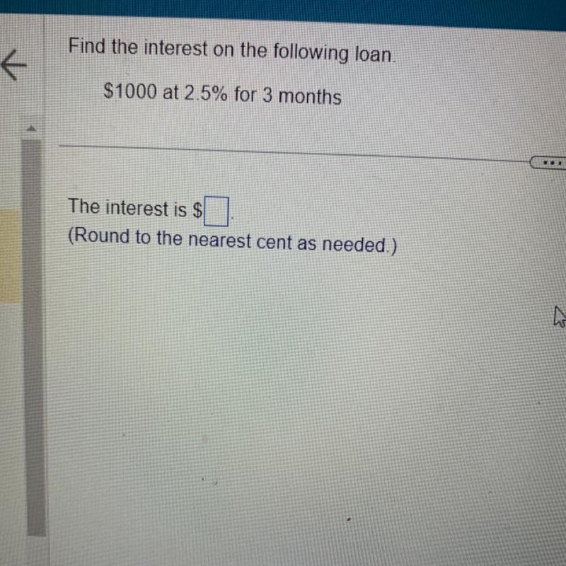 Find the interest on the following loan. $1000 at 2.5% for 3 months (Round to the-example-1
