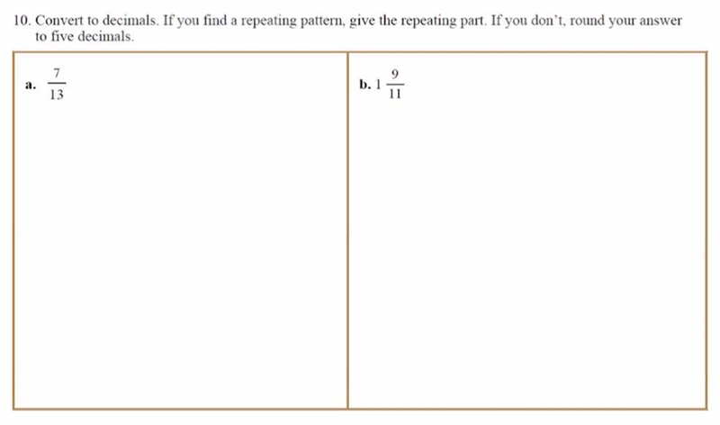 Convert to decimals. If you find a repeating part. If you don't, round your answer to five decimals. QUESTIONS ARE ON THE IMAGE PLEASE HELP!!!