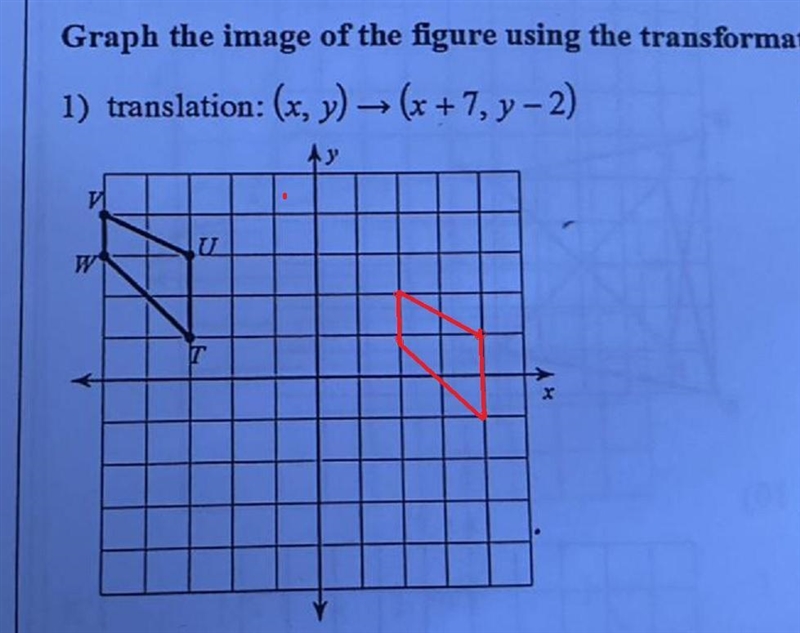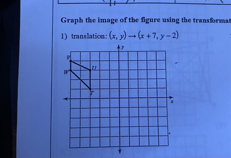 Graph the image of the figure using the transformation given 1) translation: (x,y) —>(x+7, y-2)