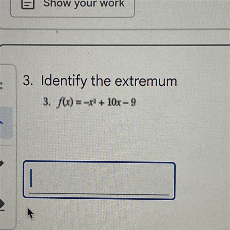 Step-by-step explanation: so, To identify the extremum of the function f(x) = -x + 10x - 9, we need to find the maximum or minimum point on the graph of the function.
