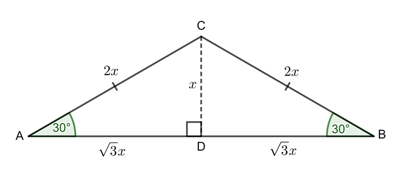 As the base angles of isosceles triangle ABC are 30°, and CD is the perpendicular bisector of the base AB, triangles ACD and ABD are congruent 30-60-90 right triangles.