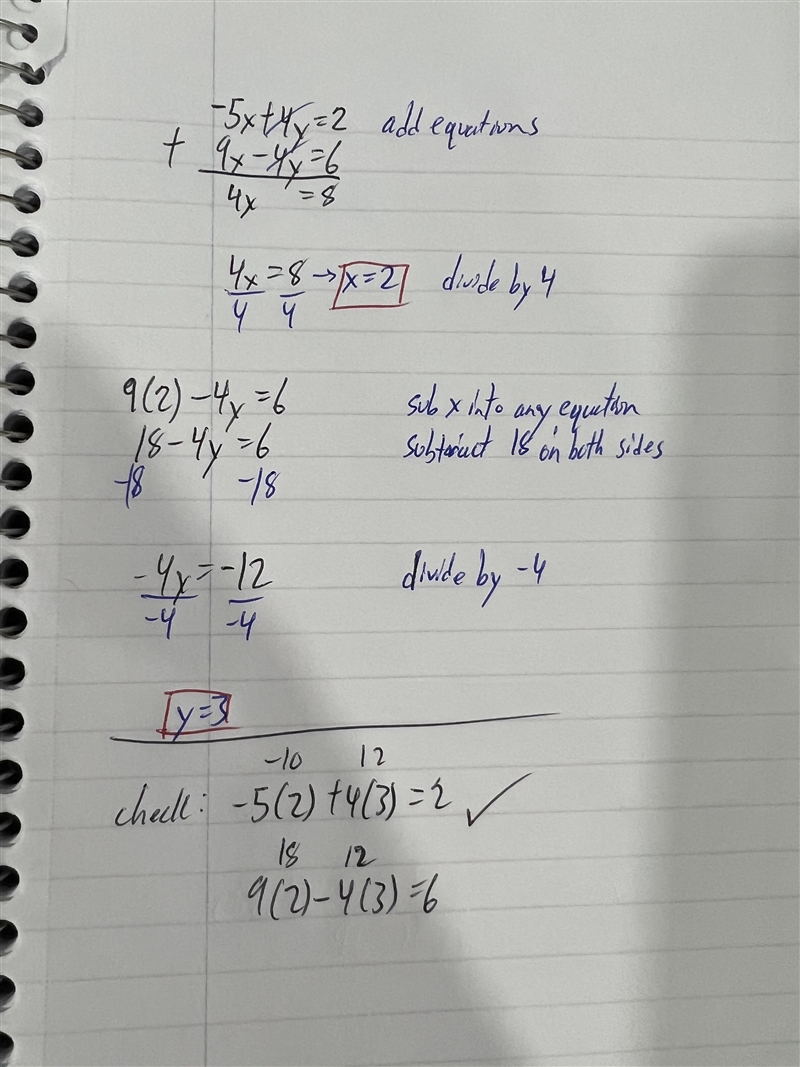 Solve this system of equations by using the elimination method. -5x + 4y = 2 9x - 4y = 6