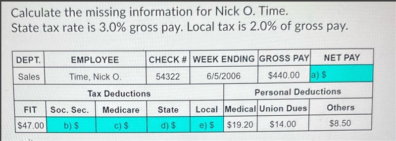 Net Pay: Subtract the total deductions (FIT, Soc. Sec., Medicare, State Tax, Local Tax, Medical & Union Dues) from Nick's gross pay: Net Pay = $440.00 - ($47.00 + $32.00 + $7.00 + $13.20 + $8.80 + $19.20 + $14.00) = $281.00